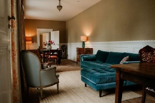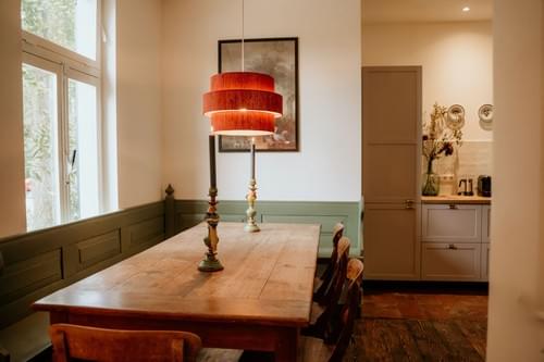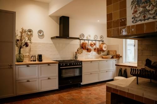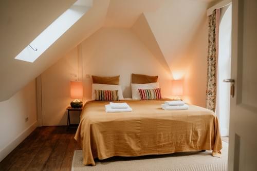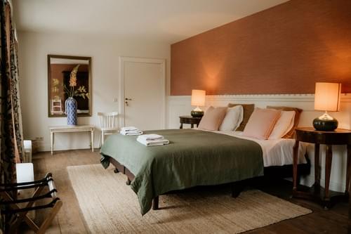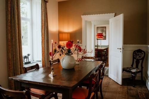 Het lagere gedeelte van de aanbouw van het Landhuis - daar waar vroeger de keuken, de eetkamer, de logeerkamer en de kamers van de bodes waren - is recentelijk verbouwd tot een comfortabel gastenverblijf met gezellige leefkeuken met houtkachel, knusse zitkamer, drie 2-persoons slaapkamers en twee luxe badkamers, waarvan een grenzend aan de masterbedroom. Dit verblijf biedt een mooi uitzicht op onze landschapstuin en Torenwoning.
